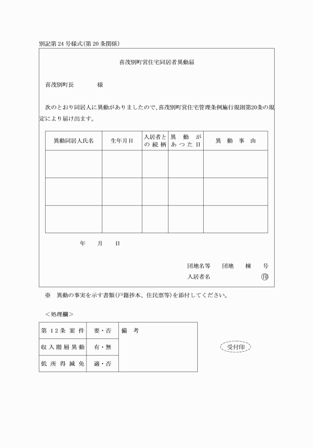 第21条 入居者は、町営住宅を退去しようとするときは、退去する5日前までに別記第25号様式により退去する旨町長に届け出なければならない。