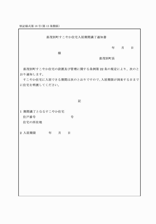 第14条 町長は、条例第23条第1項各号のいずれかに該当すると認めた入居者に対し、喜茂別町すこやか住宅明渡請求書(別記様式第19号)を当該入居者に交付するものとする。